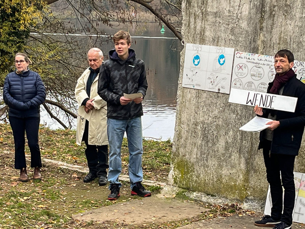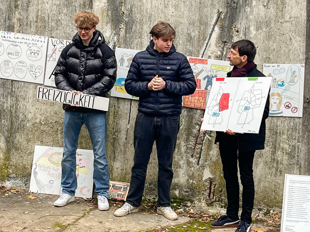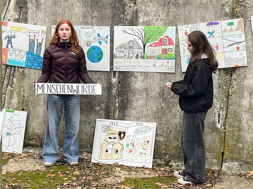 Am 9.11. bündeln sich viele Ereignisse der Deutschen Geschichte. Bei der Gedenkveranstaltung am Griebnitzsee wurden Ergebnisse eines Workshops vorgesellt. Schüler:innen der Jahrgangsstufe 11 haben in Zusammenarbeit mit der LAKD Comics zum Thema Menschenrechte entwickelt. Zentrale Themen waren Meinungsfreiheit, Menschenwürde und Freizügigkeit. Die Schüler:innen waren sehr beeindruckt vom Zeitzeugengespräch mit Uwe Fröhlich und konnten sich durch die Unterstützung der Künstler von "Zoom und Tinte" gut in die Zeit der DDR einfühlen.