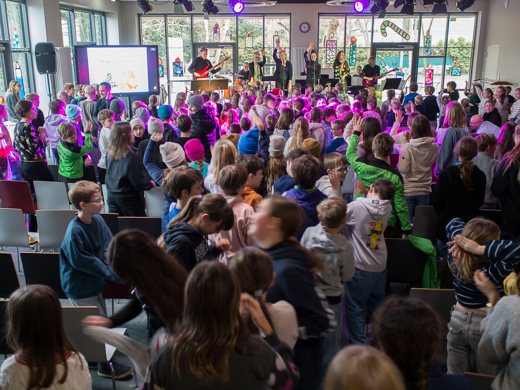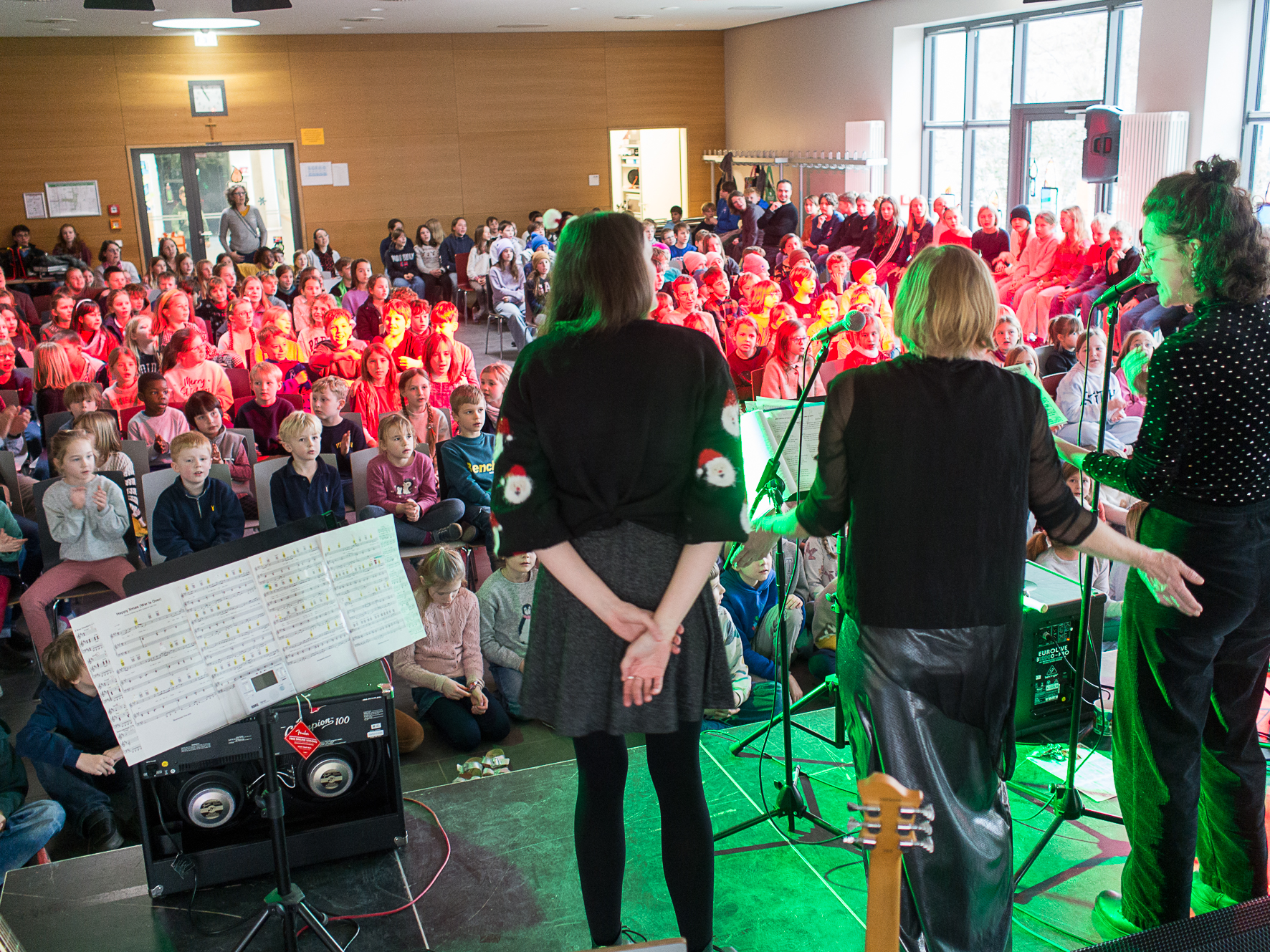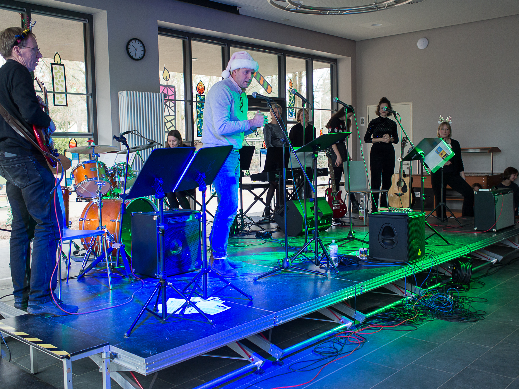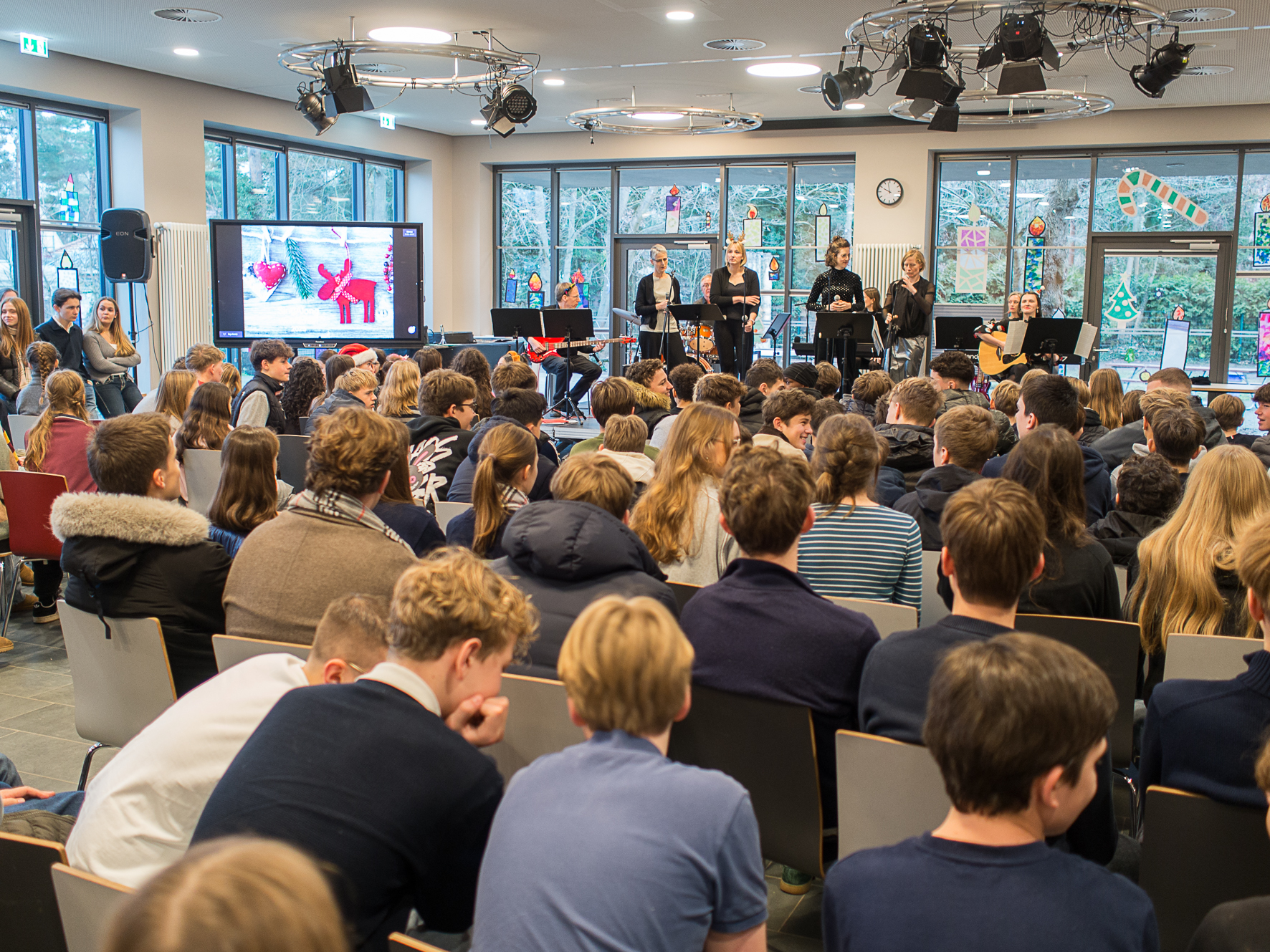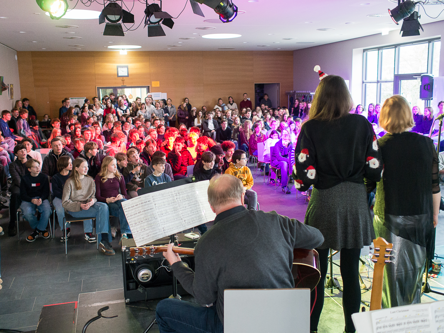 DIE BAND spielte erst für die Schülerinnen und Schüler des Gymnasiums einige Weihnachtshits und begleiteten bekannte Weihnachtslieder zum Mitsingen. Für die Kinder der Grundschule fiel die Auswahl der Lieder altersentsprechend etwas anders aus. Unsere Bandmitglieder des Kollegiums rockten alle Kinder von den Stühlen. Es war wirklich toll anzuschauen, wie die Kinder anfingen zu tanzen. So konnten alle fröhlich und beschwingt in die Weihnachtsferien gehen.