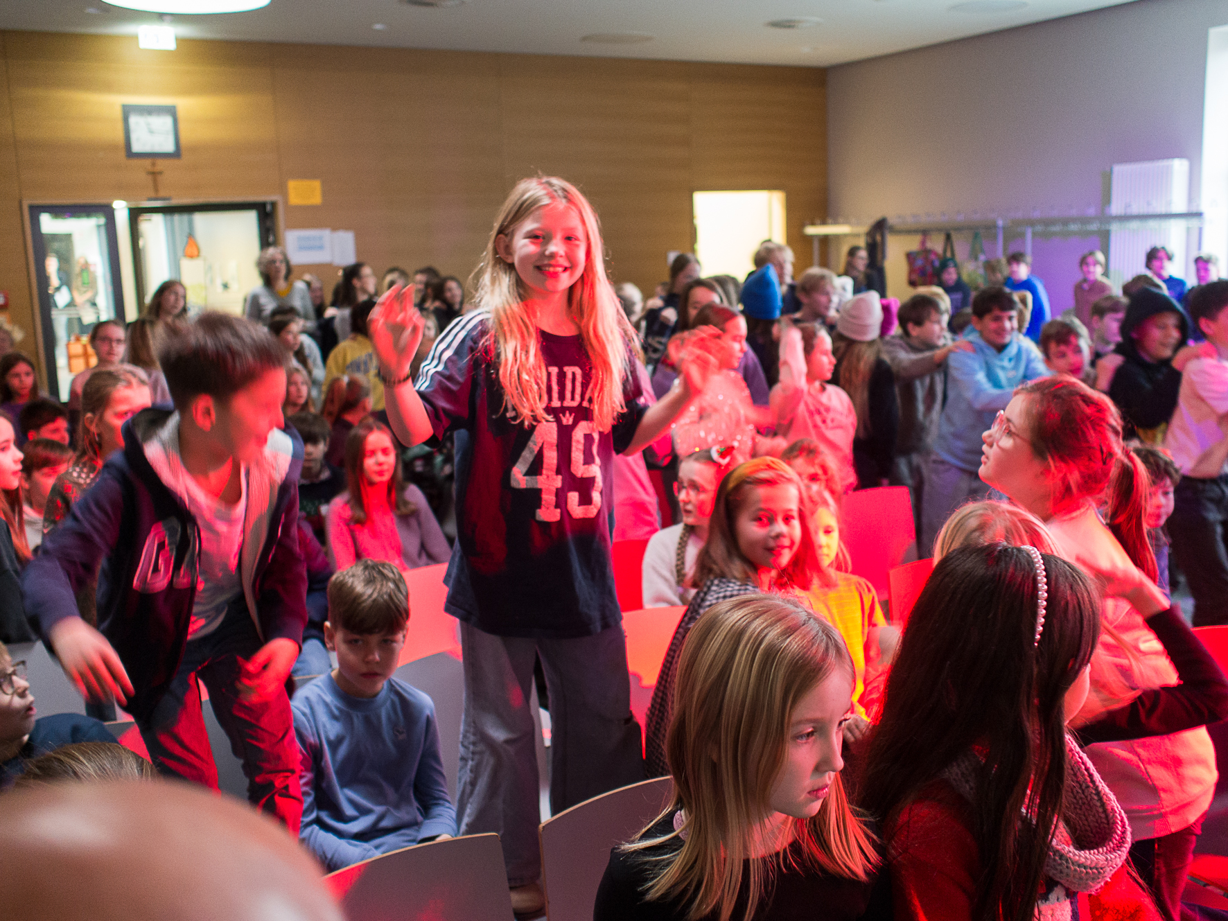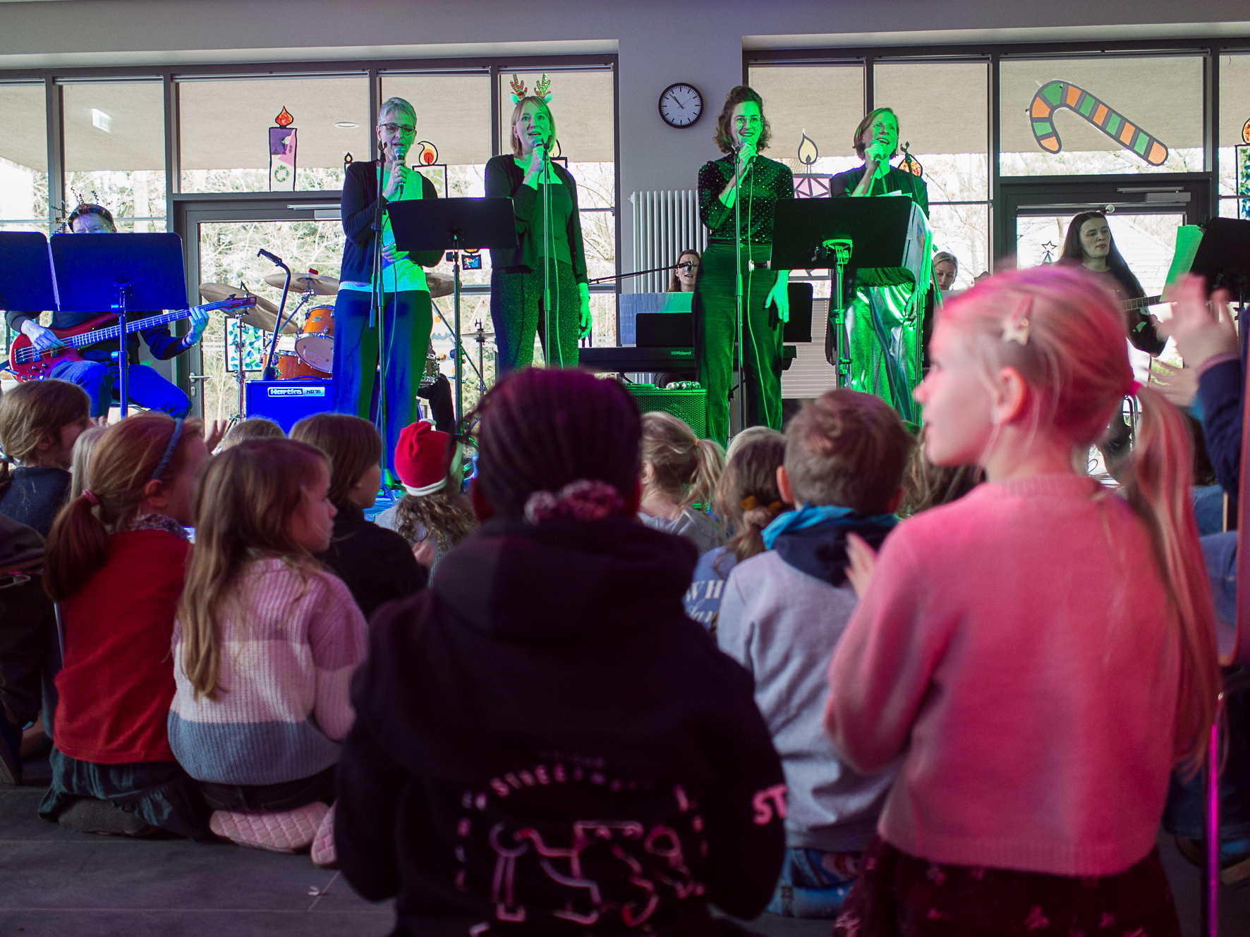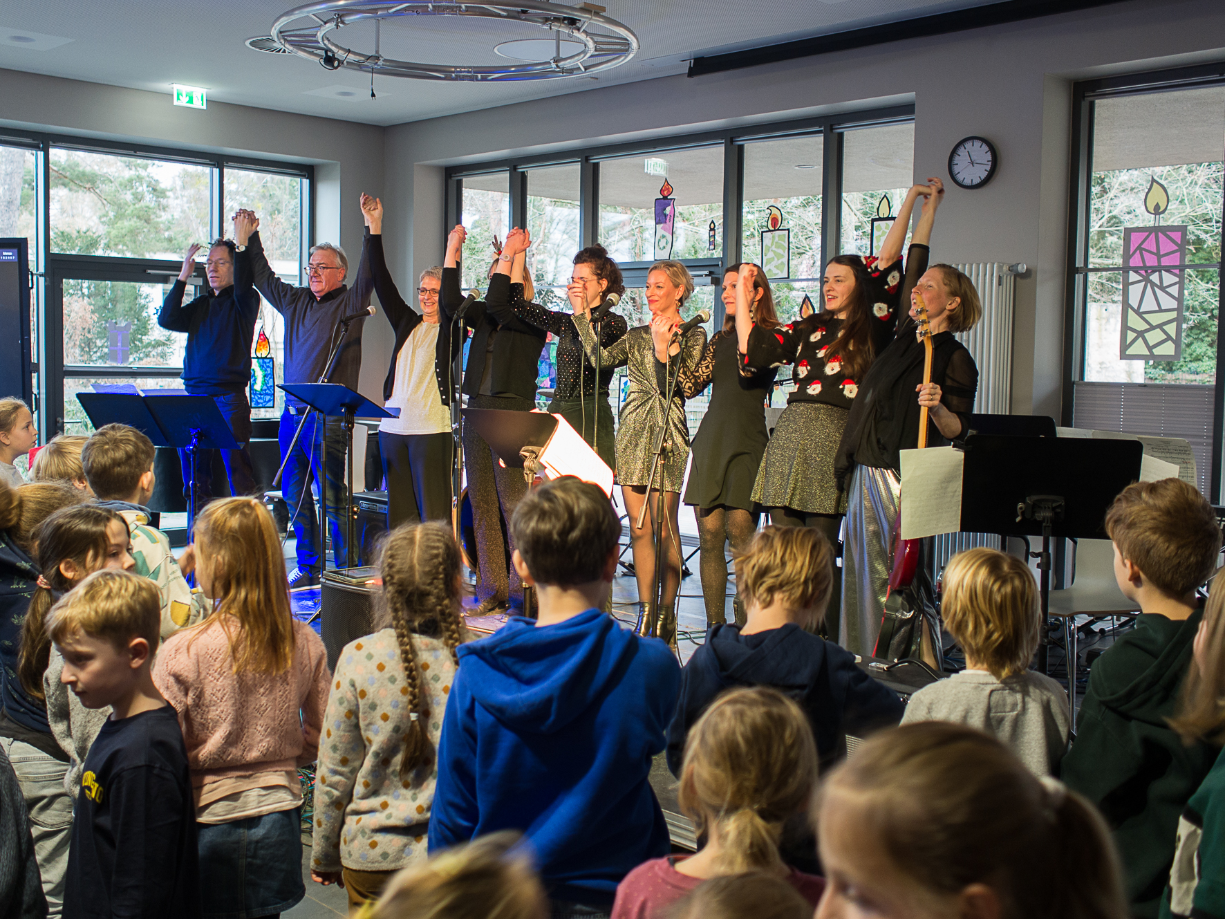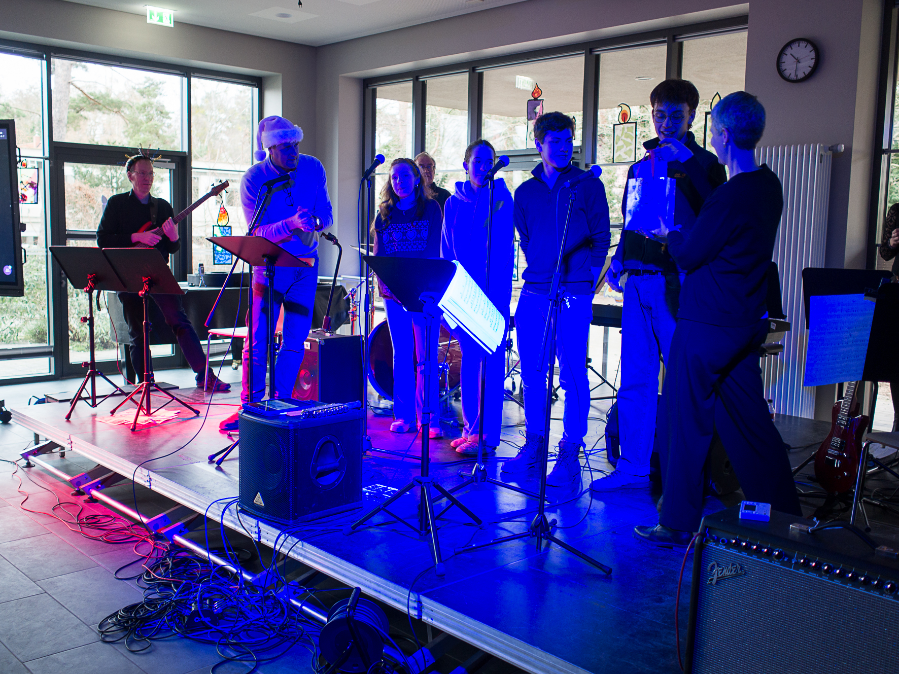 DIE BAND spielte erst für die Schülerinnen und Schüler des Gymnasiums einige Weihnachtshits und begleiteten bekannte Weihnachtslieder zum Mitsingen. Für die Kinder der Grundschule fiel die Auswahl der Lieder altersentsprechend etwas anders aus. Unsere Bandmitglieder des Kollegiums rockten alle Kinder von den Stühlen. Es war wirklich toll anzuschauen, wie die Kinder anfingen zu tanzen. So konnten alle fröhlich und beschwingt in die Weihnachtsferien gehen.