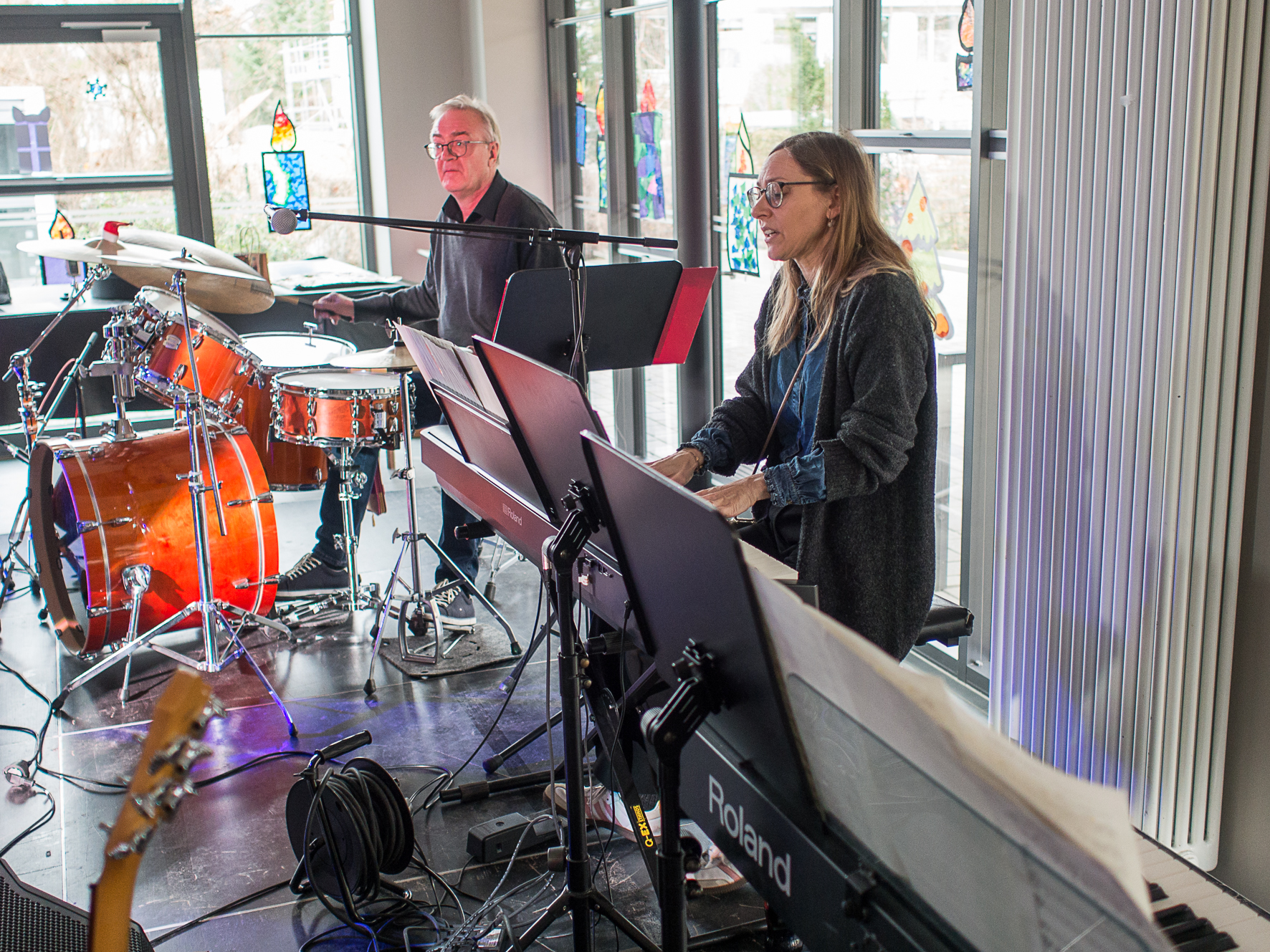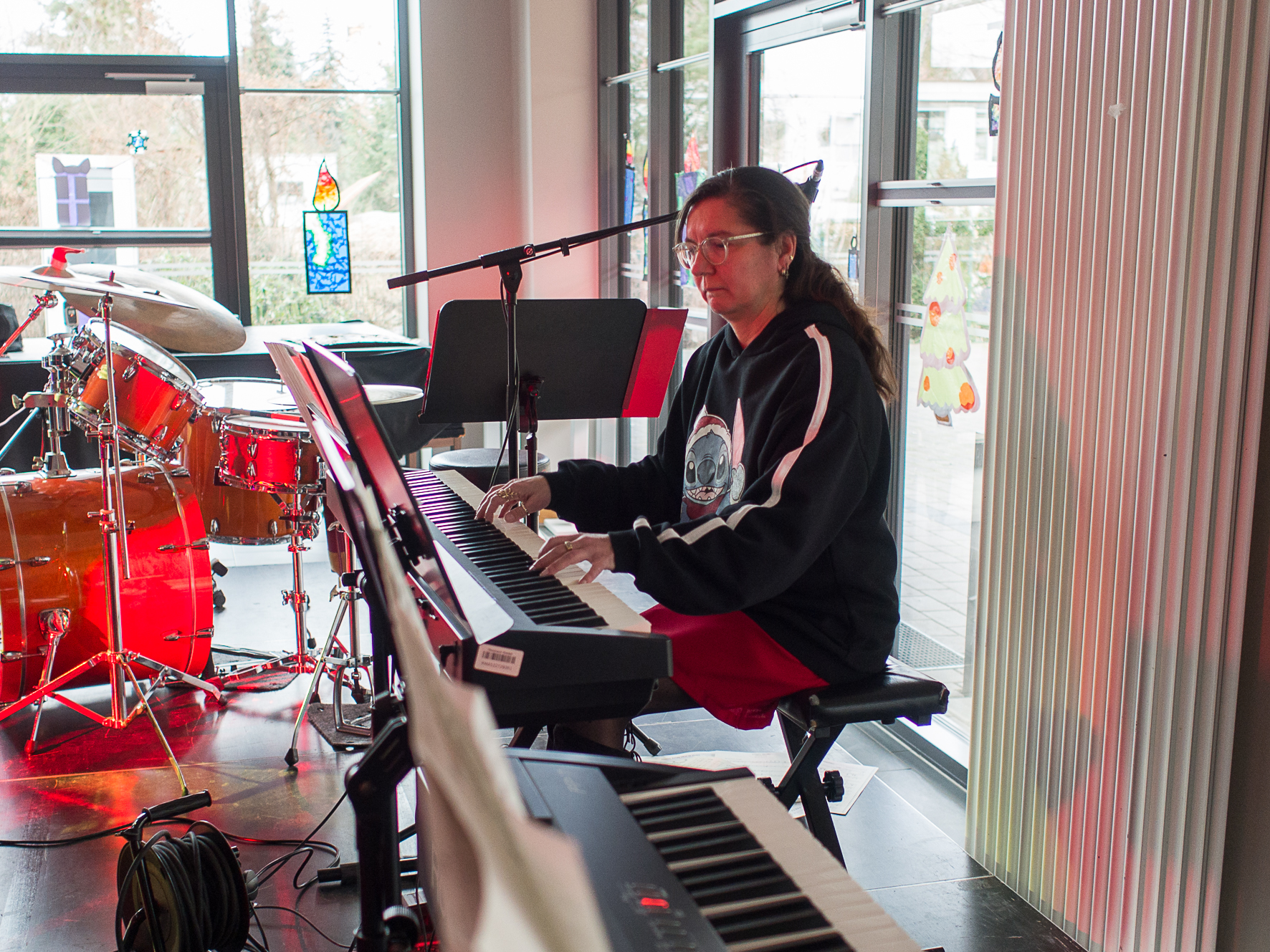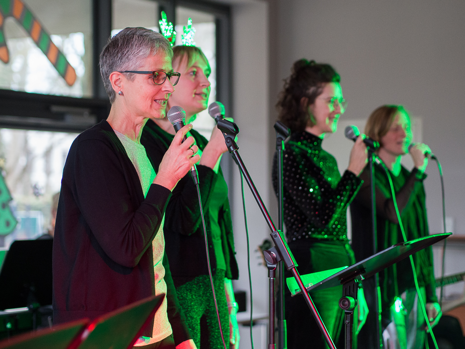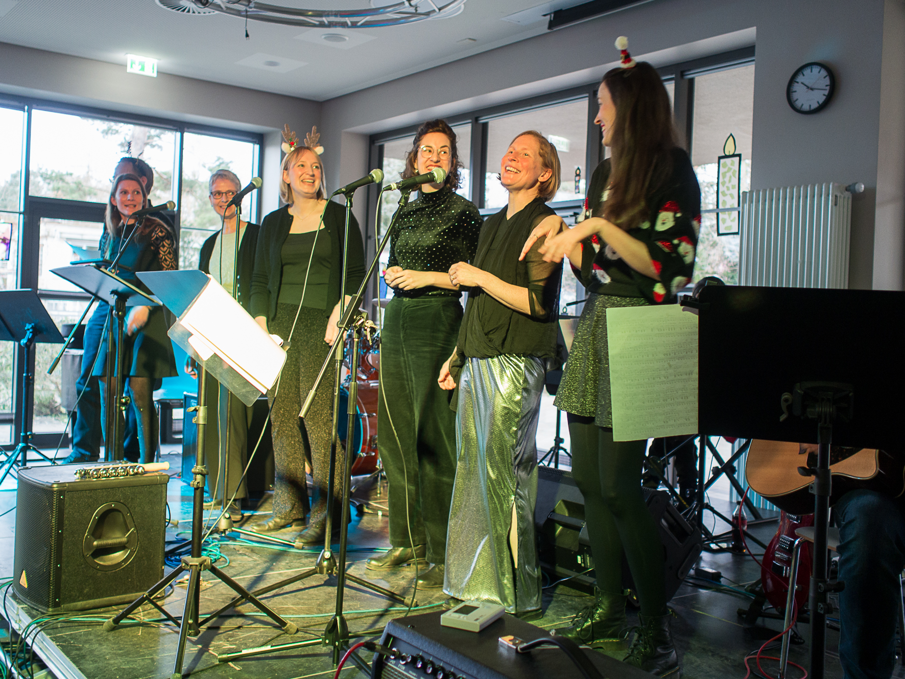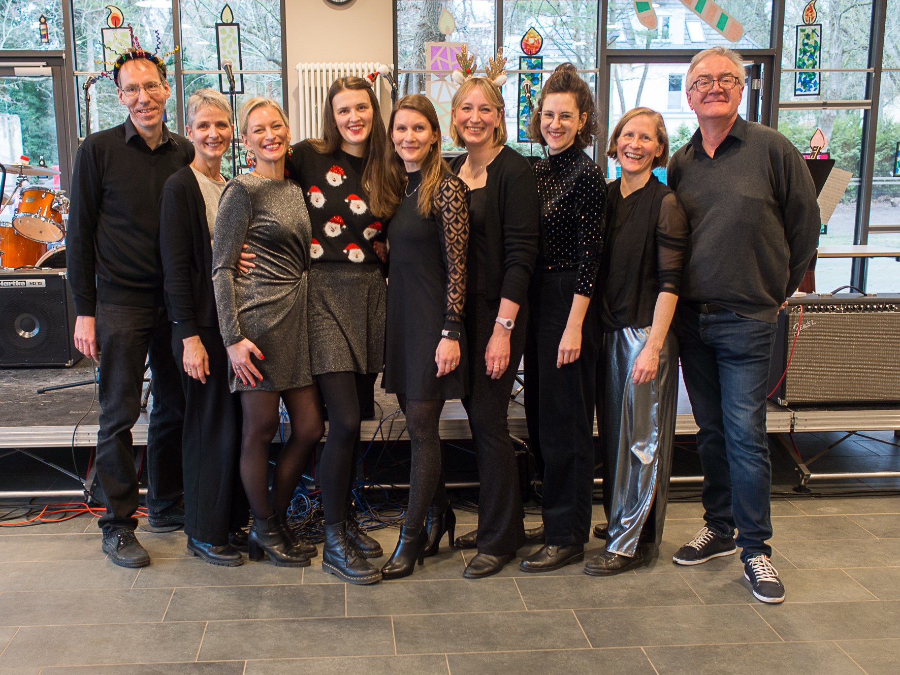 DIE BAND spielte erst für die Schülerinnen und Schüler des Gymnasiums einige Weihnachtshits und begleiteten bekannte Weihnachtslieder zum Mitsingen. Für die Kinder der Grundschule fiel die Auswahl der Lieder altersentsprechend etwas anders aus. Unsere Bandmitglieder des Kollegiums rockten alle Kinder von den Stühlen. Es war wirklich toll anzuschauen, wie die Kinder anfingen zu tanzen. So konnten alle fröhlich und beschwingt in die Weihnachtsferien gehen.