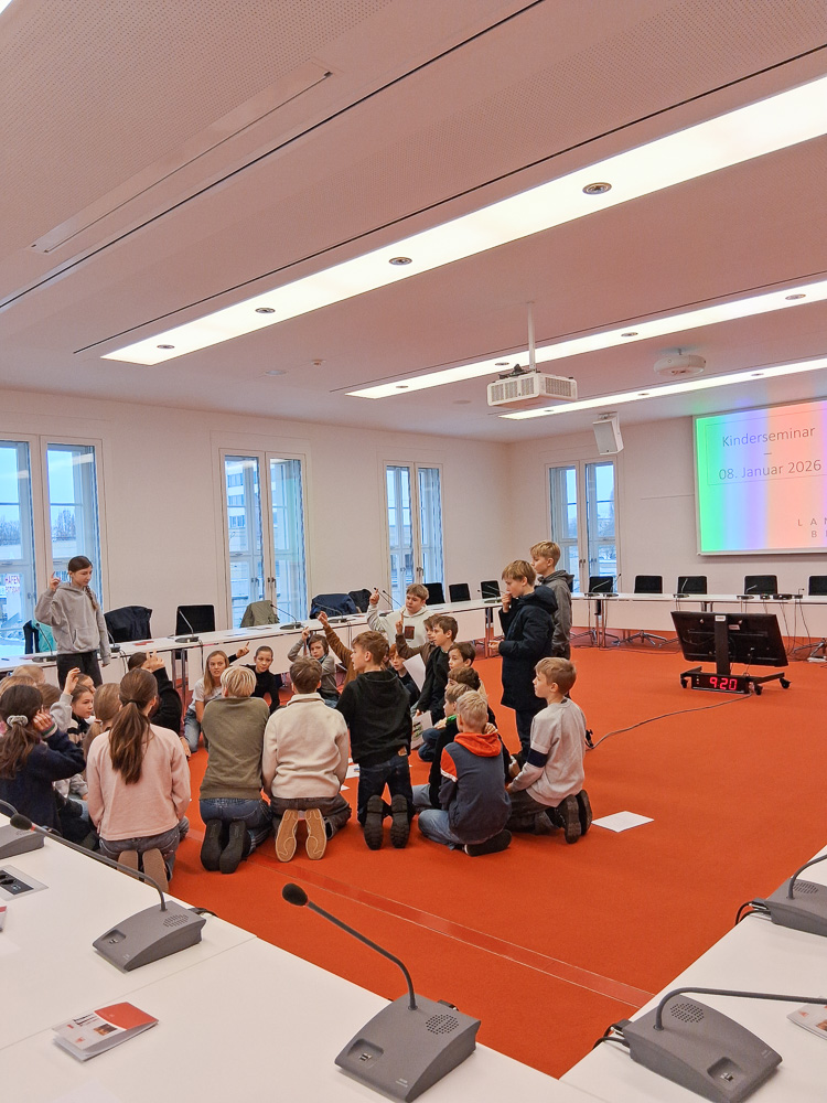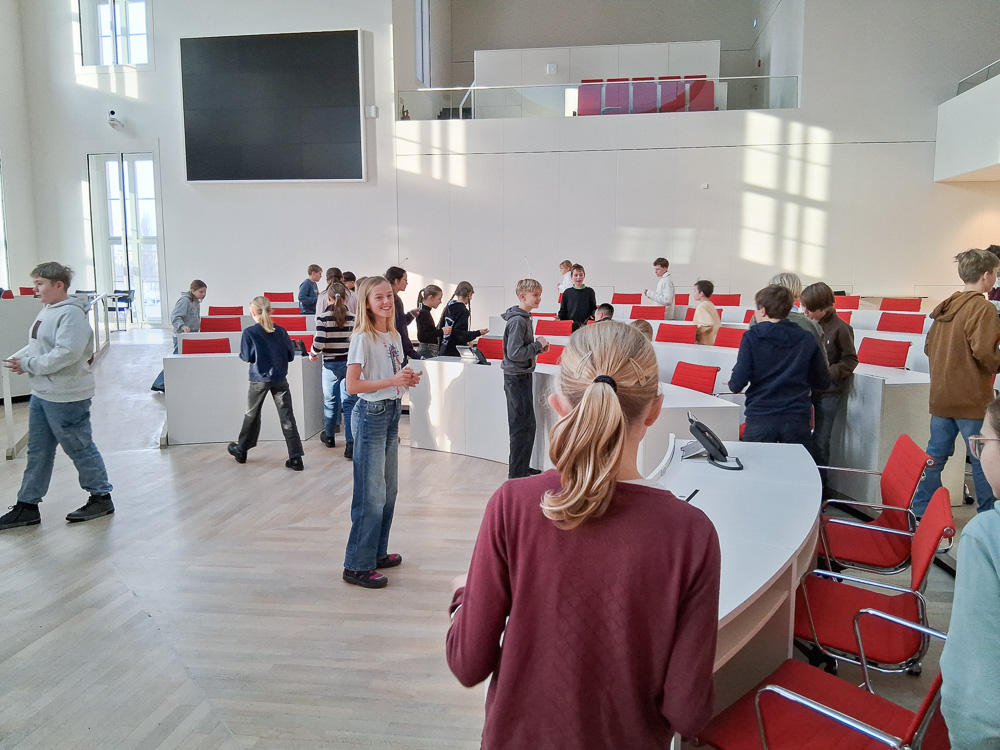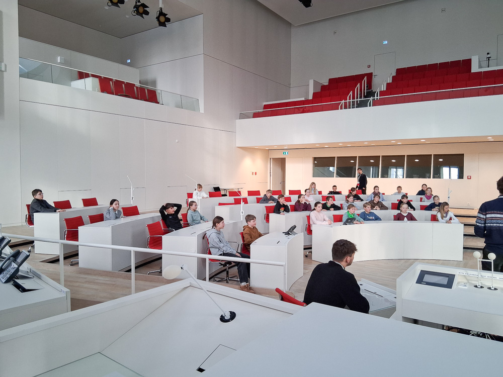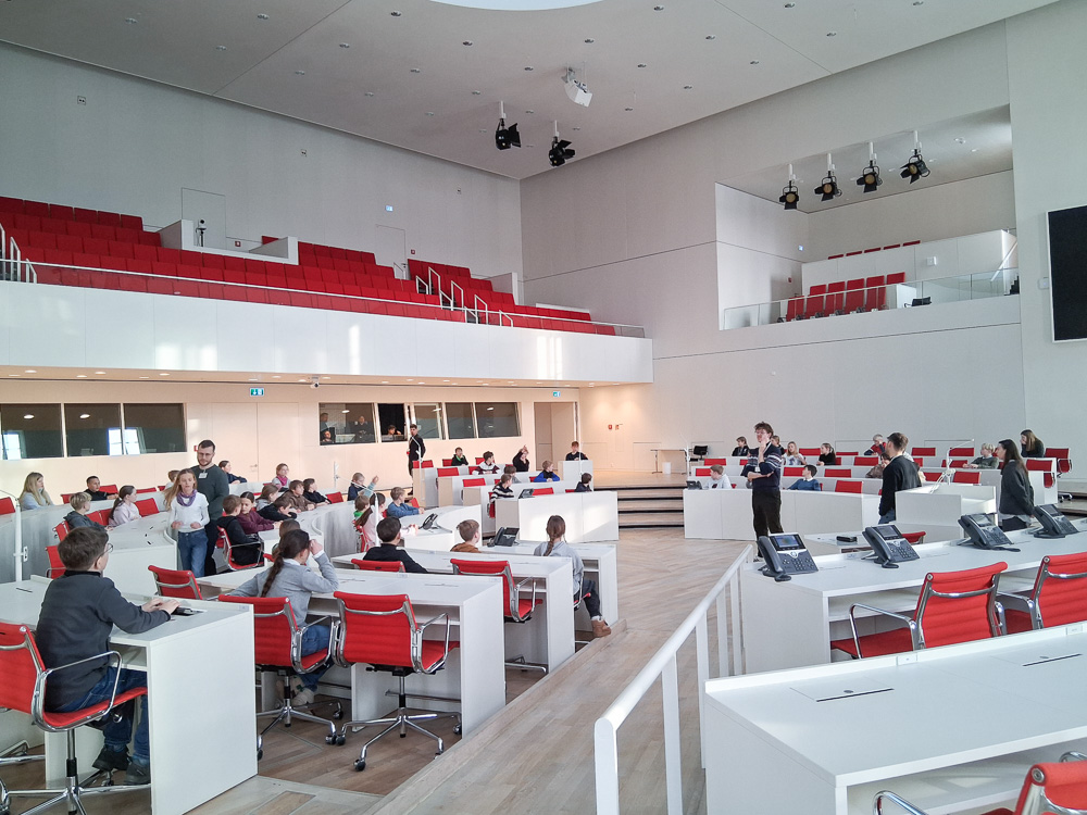 Kurz darauf gingen wir in den Plenarsaal, dort hat jeder eine Karte bekommen, wo der Name eines Abgeordneten einer Partei draufstand. Dann musste man den Namen von dieser Person suchen und sich auf den jeweiligen Platz setzen. Als jeder seinen Platz eingenommen hatte, haben wir über die jetzige Situation im Landtag gesprochen. Bald darauf gingen wir Mittagessen in der Kantine vom Landtag.