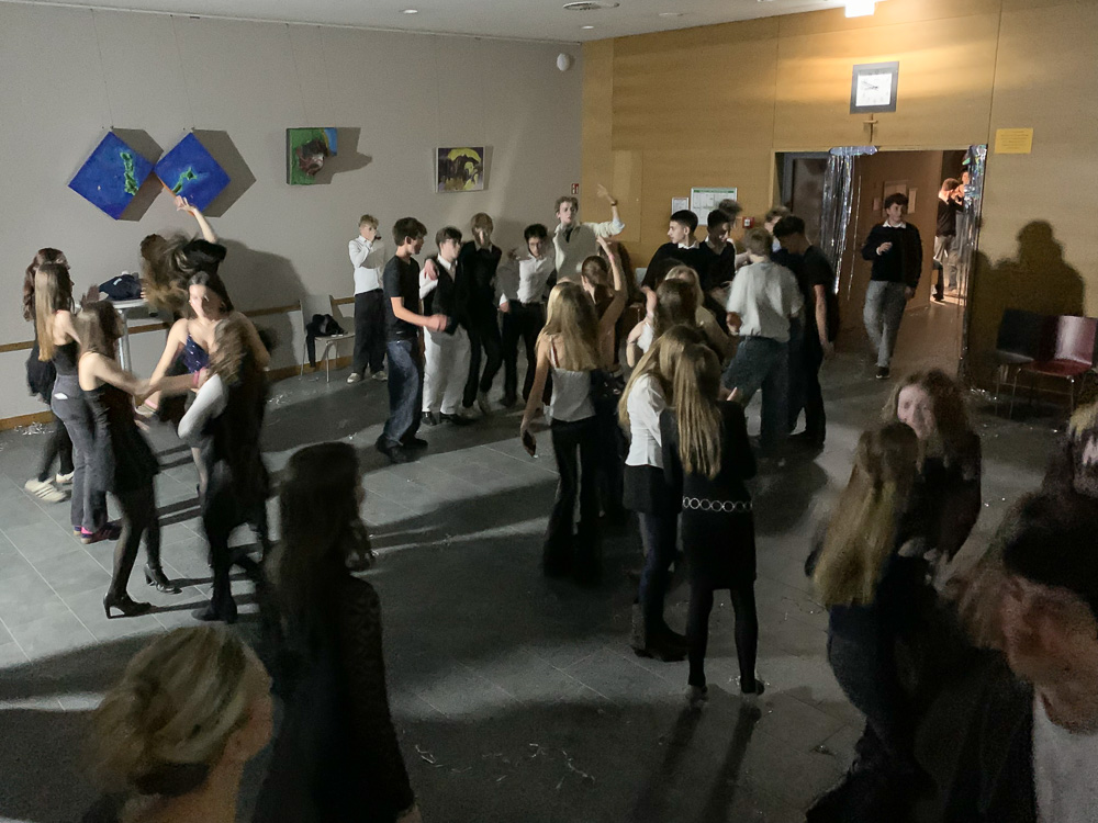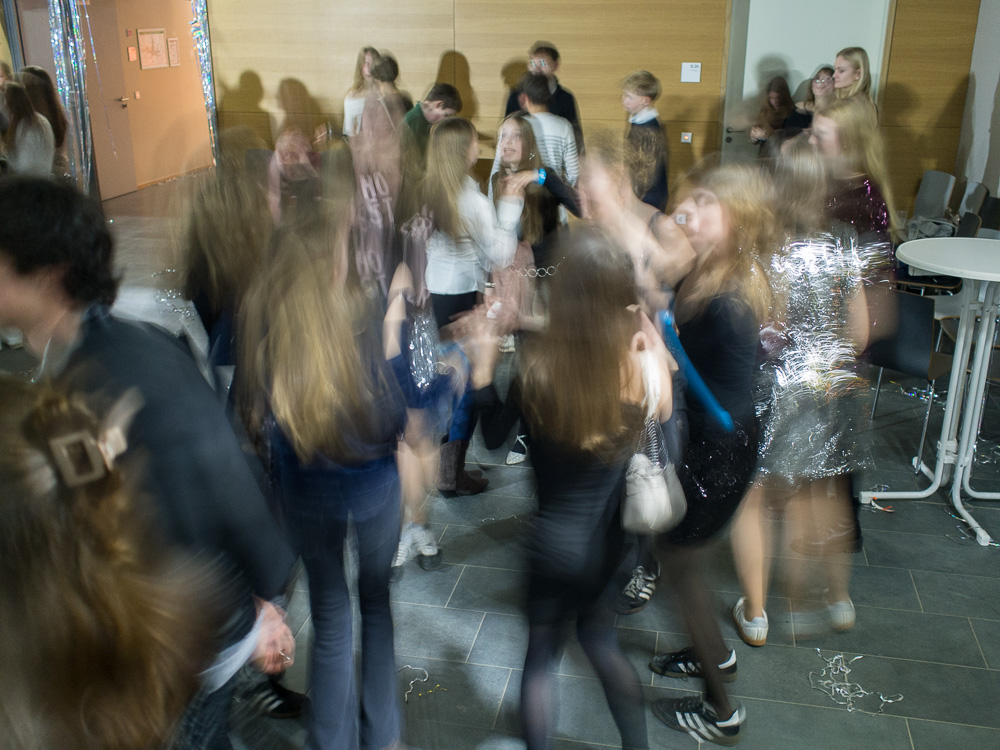 Die Technik wurde wieder von Frieda, Luise und York fachmännisch aufgebaut und Matti zeigte sein großes Talent als DJ. Es wurde wild getanzt zu wirklich toller Partymusik. Alles war festlich geschmückt und klappte hervorragend: der Einlass mit Kontrolle der Eltern-Erlaubnis-Zettel, die Garderobe, der Getränkestand mit Snackbar...