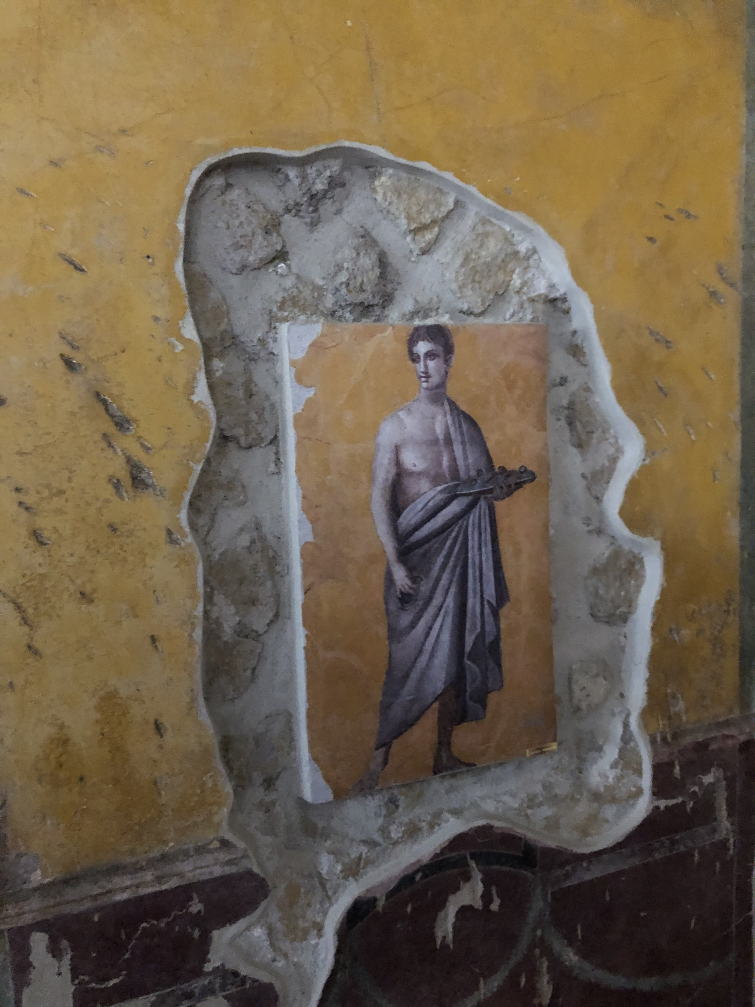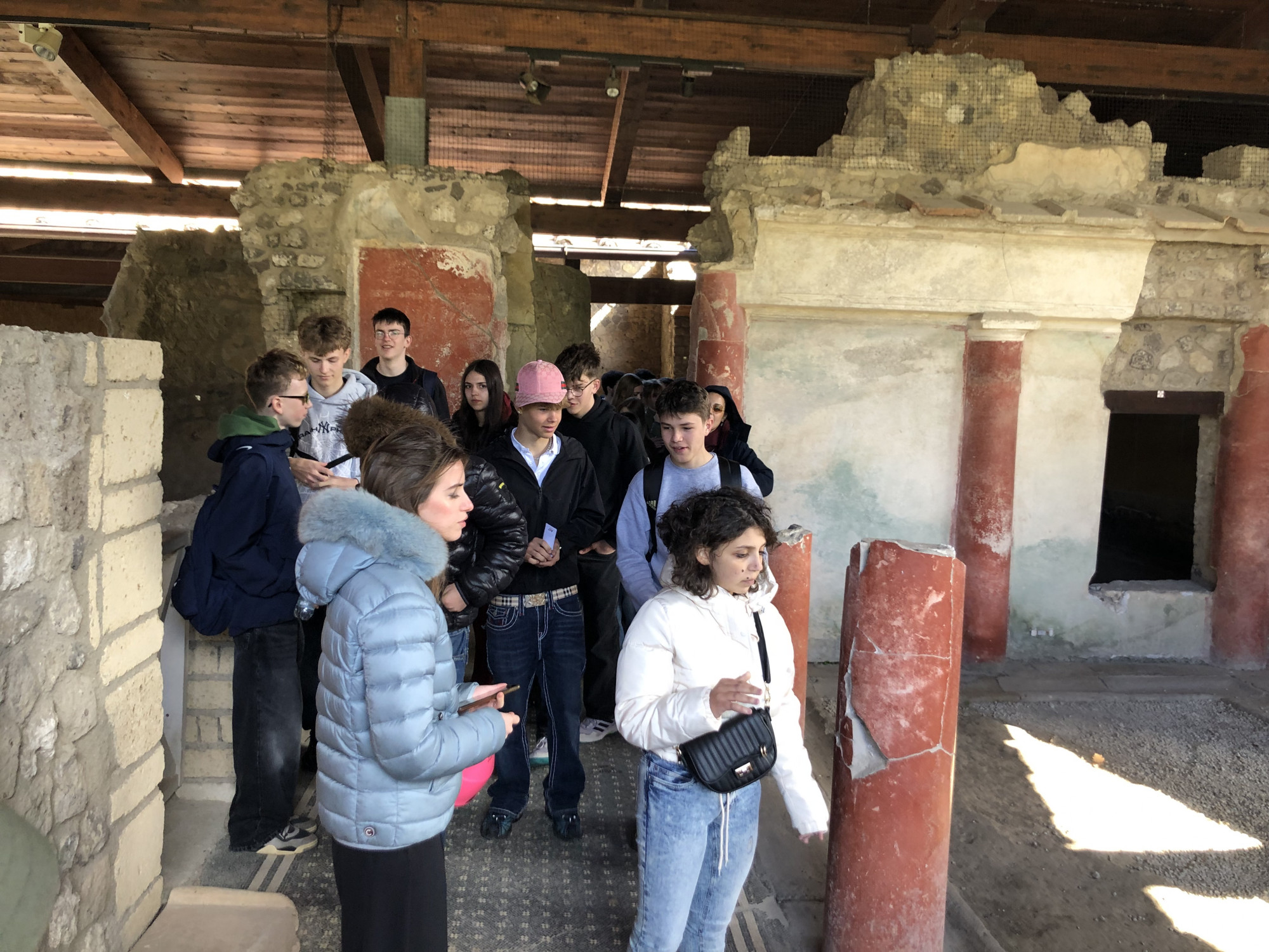 Um 7:00 gab es wie an jedem Tag Frühstück, es gab ein eher untypisches Frühstück , welches auf Croissants basierte Gegen 8:30 haben wir uns versammelt um zum Bahnhof „Meta“ zu gelangen. Von unserem Hotel, Blev village, bis dorthin war es ungefähr ein 10-minütiger Fußweg. Unsere Partnerschule haben wir dann in Castella de Stabia getroffen und sind dann, gemeinsam zu antiken Wohnorten der Römer gelaufen. Dort angekommen wurde uns, von sowohl Lehrern als auch Schülern der Ort und seine Geschichte vorgestellt. Es wurde deutlich, dass die Menschen, die dort wohnten sehr wohlhabend waren. Die Lage am Meer, die Größe und die majestätische Bauart verdeutlichten das. Vielen aus unserer Klasse fiel auf, dass in einigen Räumen der Boden mit Hakenkreuzen bedeckt war. Die Lehrerin der Partnerschule klärte uns dann aber auf das im alten Rom dieses Muster für den Sonnengott stand.