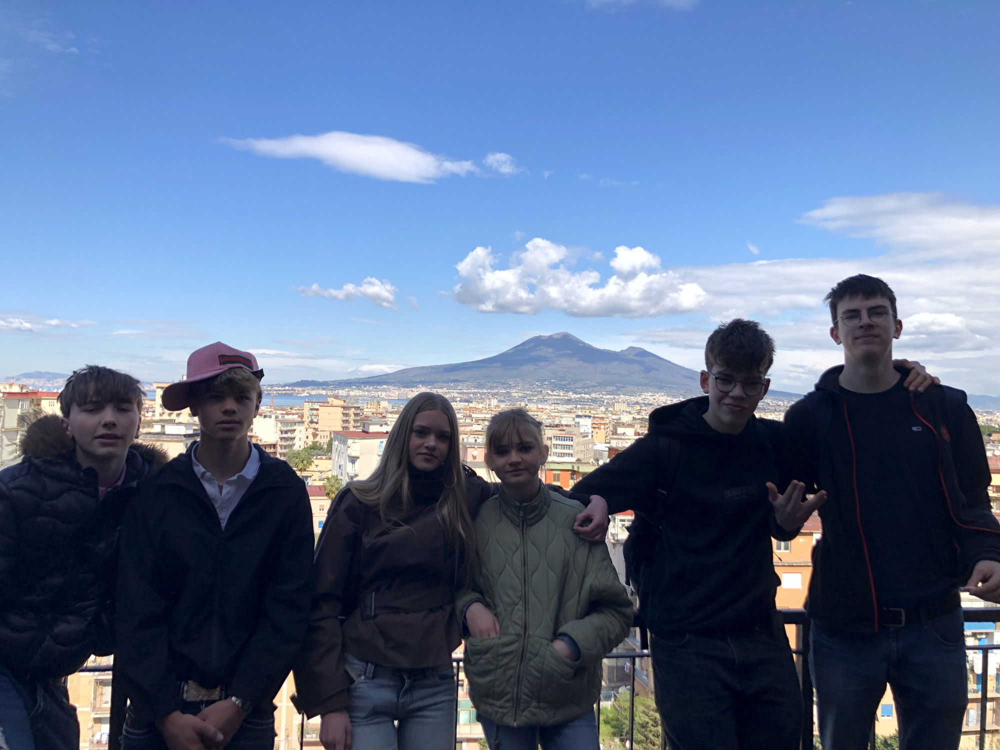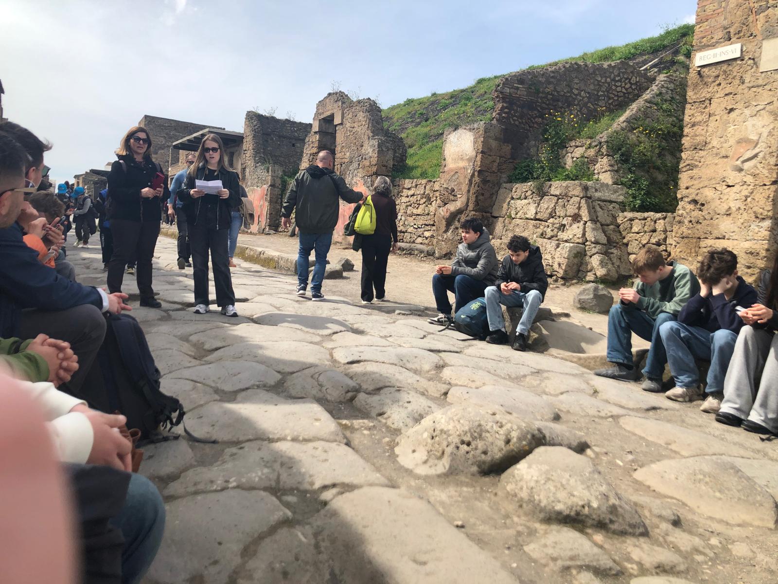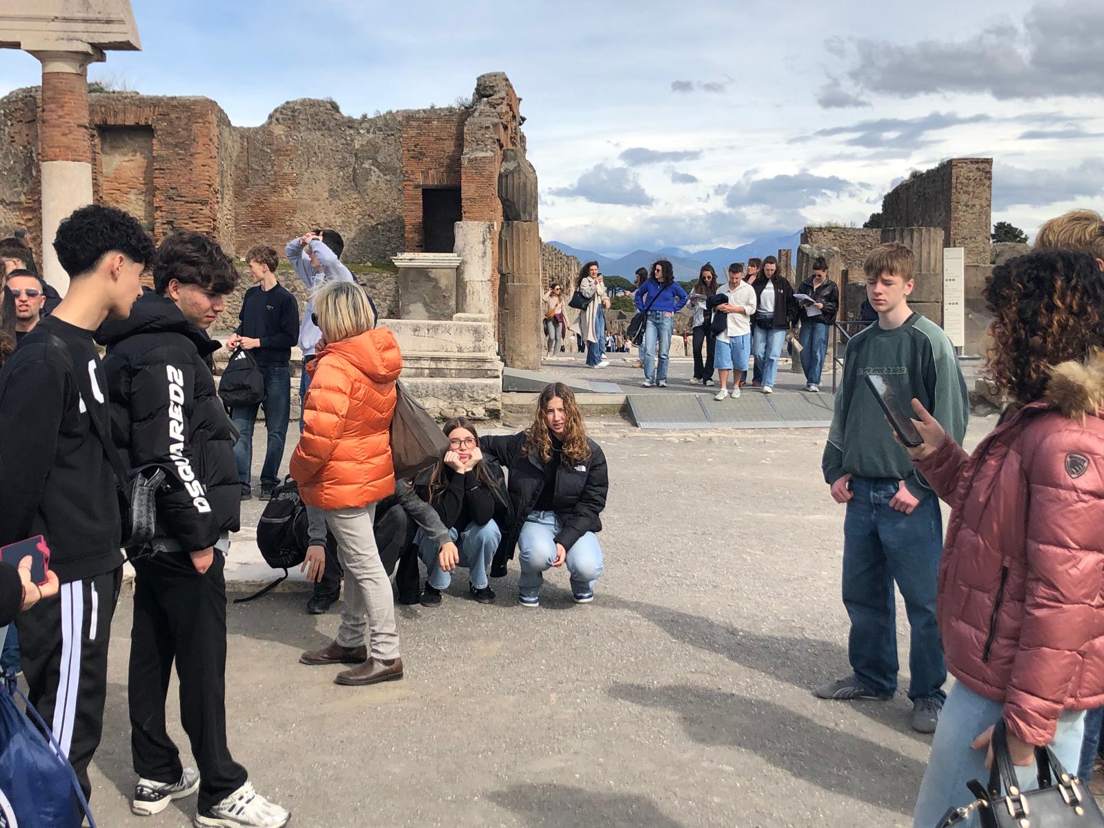 Am ersten Tag haben wir die italienische Schule besucht. Bevor wir losgegangen sind, haben wir um 7:00 Uhr im Blue Village gefrühstückt. Wir sind anschließend mit der Bahn zur italienischen Schule gefahren. Am Bahnhof wurden wir von der Klassenlehrerin der Partnerklasse abgeholt und zur Schule geführt. In der Schule haben wir uns dann in die Aula gesetzt und Begrüßungsworte zuhört. Danach hat noch eine Gruppe von Mädchen eine Performance zum Lied „Fade of Ophelia“ aufgeführt. Abgeschlossen wurde der Besuch in der Schule mit einem Besuch im Büro der Schulleitung, wo wir klassisch italienisches Gebäck essen bekommen haben. Nach dem Besuch der Schule sind wir mit der anderen Klasse mit der Bahn nach Pompeji gefahren. Dort haben wir uns die Stadt Pompeji angeschaut. Bevor wir jedoch in die Stadt gegangen sind, haben wir uns noch die versteinerten Menschen angeschaut. Anschließend sind wir dann zu den Häusern und dem Rest der Stadt gegangen. Die italienischen Schüler haben jeweils zu den Dingen, die wir uns angeguckt haben, z.B. ein altes Haus oder ein Amphitheater, den passenden Vortrag gehalten.