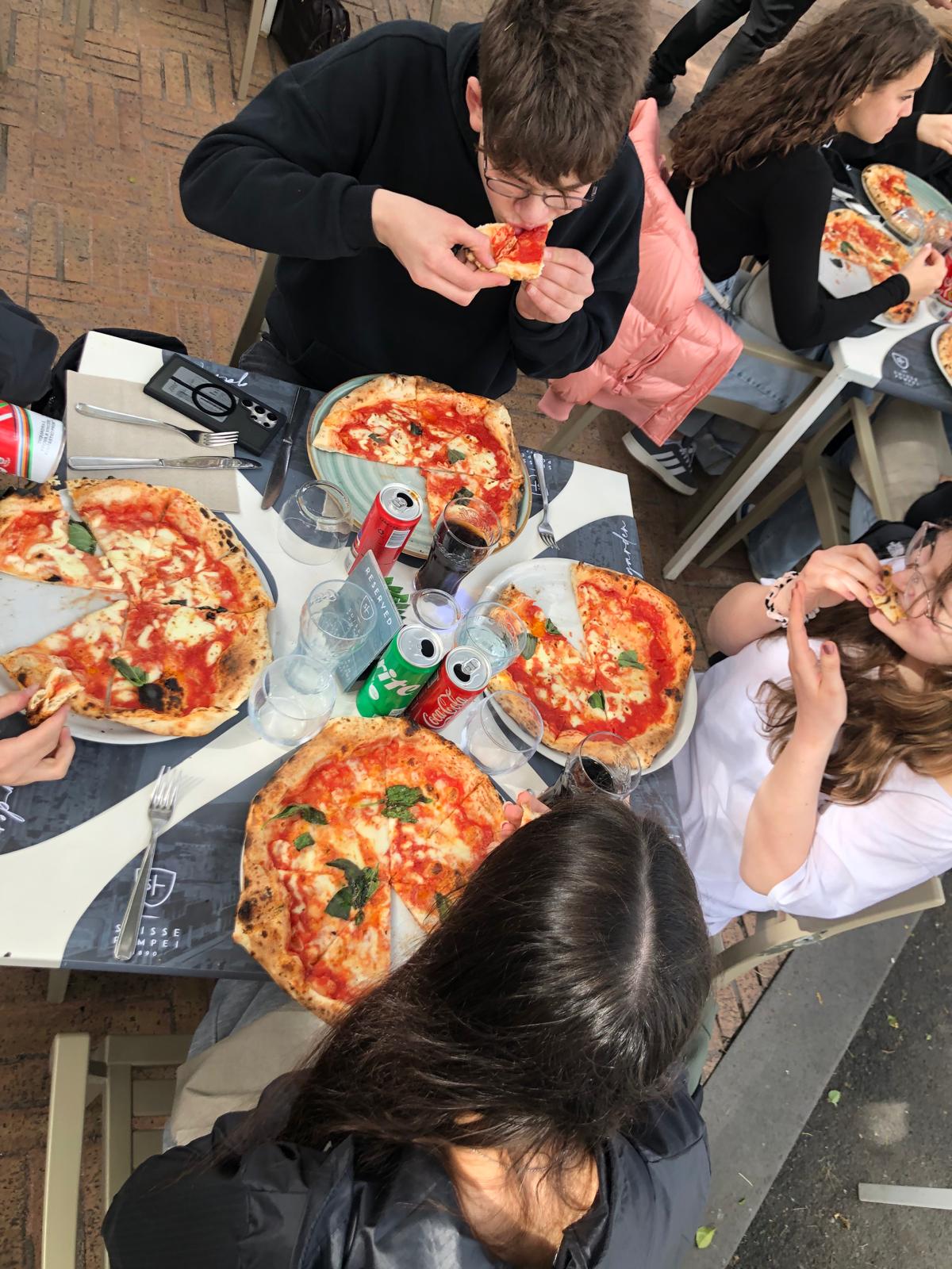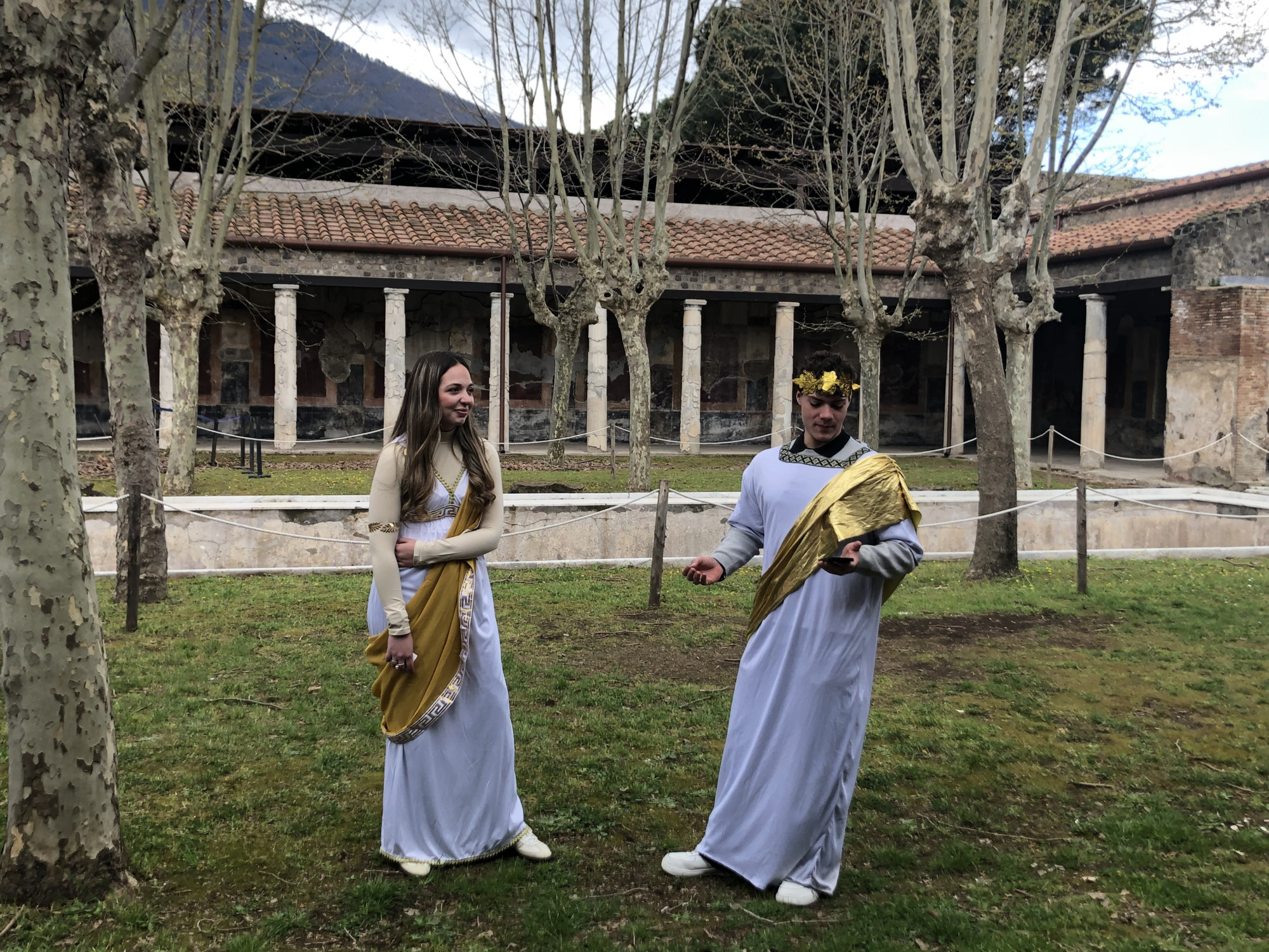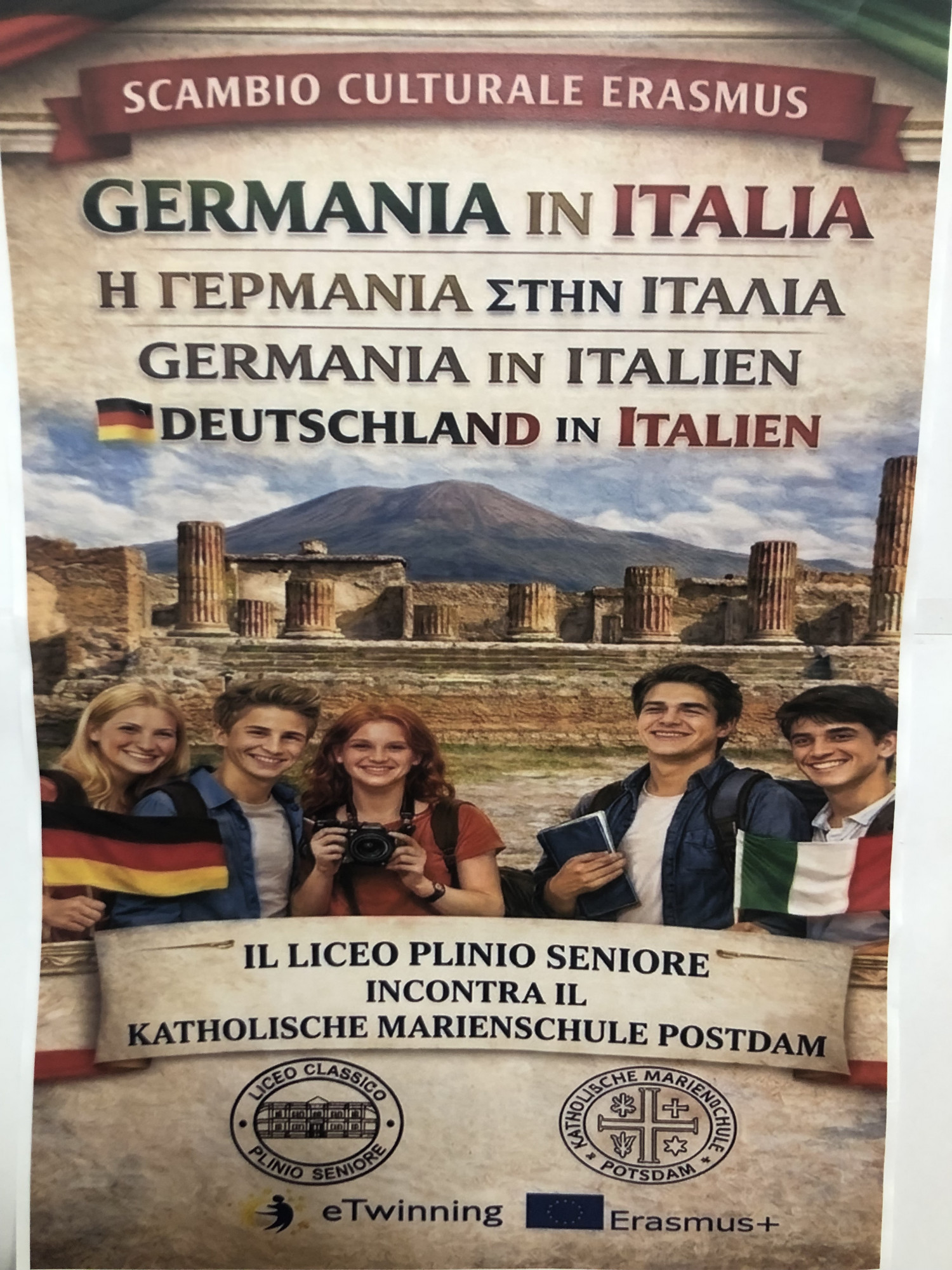 Am ersten Tag haben wir die italienische Schule besucht. Bevor wir losgegangen sind, haben wir um 7:00 Uhr im Blue Village gefrühstückt. Wir sind anschließend mit der Bahn zur italienischen Schule gefahren. Am Bahnhof wurden wir von der Klassenlehrerin der Partnerklasse abgeholt und zur Schule geführt. In der Schule haben wir uns dann in die Aula gesetzt und Begrüßungsworte zuhört. Danach hat noch eine Gruppe von Mädchen eine Performance zum Lied „Fade of Ophelia“ aufgeführt. Abgeschlossen wurde der Besuch in der Schule mit einem Besuch im Büro der Schulleitung, wo wir klassisch italienisches Gebäck essen bekommen haben. Nach dem Besuch der Schule sind wir mit der anderen Klasse mit der Bahn nach Pompeji gefahren. Dort haben wir uns die Stadt Pompeji angeschaut. Bevor wir jedoch in die Stadt gegangen sind, haben wir uns noch die versteinerten Menschen angeschaut. Anschließend sind wir dann zu den Häusern und dem Rest der Stadt gegangen. Die italienischen Schüler haben jeweils zu den Dingen, die wir uns angeguckt haben, z.B. ein altes Haus oder ein Amphitheater, den passenden Vortrag gehalten.